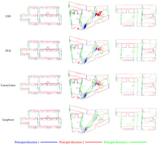 Currently, many studies have focused on extracting structurally meaningful geometric primitives from raw point clouds to simplify spatial representation and reduce redundancy [12,13,14]. These primitives are typically classified into shape-based elements (e.g., lines, planes, and volumes) and structure-based elements (e.g., edges and skeletons). Among them, line features provide a concise and informative representation of describing the geometric outlines of objects, with low dimensionality and a parametric form that allows direct expression through endpoint coordinates and direction vectors. As such, line features serve as a crucial bridge between raw point clouds and structured geometric modeling [15]. Nevertheless, current line extraction methods often suffer from issues such as fragmentation, discontinuity, and angular deviation, which is primarily caused by variations in point cloud density as well as occlusions and noise arising from data acquisition. In addition, existing approaches [16,17,18,19] are still largely confined to edge-detection-based strategies, which are effective for highlighting boundary cues but insufficient for directly deriving line segments or parametric line representations. This leads to a lack of robust structural descriptors that can directly support geometry-based modeling. Moreover, most line segment extraction methods [20,21,22,23] tend to treat each line segment independently, without explicitly considering their topological associations such as adjacency, connectivity, and intersection relationships. This simplification often results in incomplete contours, misaligned corners, and deviations at structural junctions, thereby restricting the integrity and applicability of extracted features in large-scale architectural environments. Although several topology-aware methods [24,25,26,27,28] have been developed, they are primarily oriented toward capturing the global spatial layout of structures, and often fail to preserve the finer geometric details of local contours, resulting in a gap between large-scale organization and precise structural representation. These limitations compromise the integrity and precision of extracted geometric features and restrict their application in high-level modeling tasks. Therefore, overcoming these limitations is essential for achieving reliable and high-quality extraction of structural line features from building point clouds.