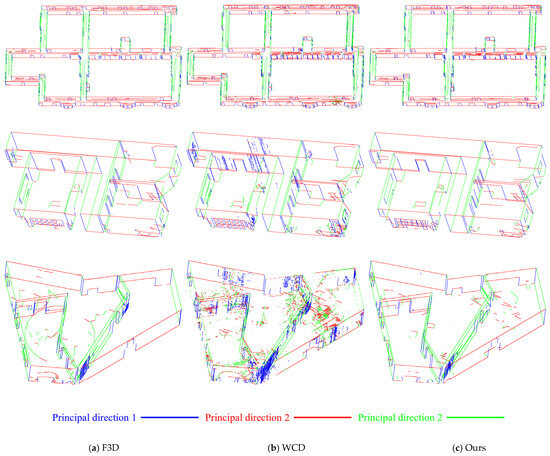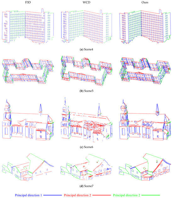 We further extend the line segment extraction to four outdoor building façade scenes and conduct a qualitative comparison among F3D, WCD and our method. Given that outdoor scenes are generally larger in scale than indoor scenes, an angle threshold of 20° was selected for region growing and merging to ensure local planarity and reduce over-segmentation that may cause redundant line segments. Figure 22 presents the extraction results under each of the three geometric constraints in Scene7. Because the roof structure is not strictly orthogonal, applying the orthogonality constraint incorrectly alters the actual roof structure. Specifically, the two roof planes generate three dominant directions without being mutually orthogonal. As a result, the longer beam line segment (green) is regarded as the reference, which causes the eave line segments (both red and blue) to be miscorrected toward an angle orthogonal to the other two dominant directions. In this case, the collinearity constraint proves more suitable and is therefore adopted as the final constraint for comparison.