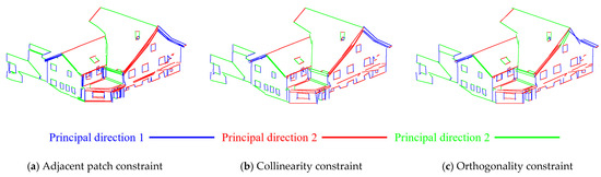 (3) 3D line optimization. Considering the spatial regularity of building structures, a geometric regularization process is applied to optimize the initial 3D line segments by introducing adjacency, collinearity, and orthogonality constraints. These constraints jointly improve structural coherence by correcting angular deviations between adjacent patches, merging collinear segments to reduce redundancy, and refining orthogonal relationships to enhance closure and directional accuracy. Through these operations, the refined 3D line segments exhibit better continuity, completeness, and directional accuracy, providing a more coherent and reliable geometric representation.