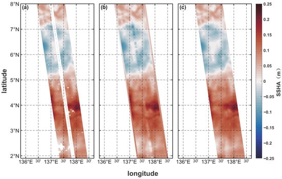 As Figure 1a shows, the Nadir altimeter provides uniform measurements across the central swath along the satellite track, but systematic differences exist with KaRIn observations. Although nadir data fill central swath gaps, interpolation induces mismatches in the study region. Direct interpolation of merged data causes spatial discontinuities in the central swath (Figure 1b). Excluding nadir data prior to interpolation eliminates this effect, yielding smoother results with enhanced data integrity (Figure 1c) [].