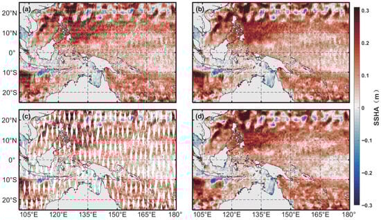 Comparison of the full-cycle and the single sub-cycle conversion process from orbital swath data to gridded maps for the SWOT satellite over the tropical western Pacific region. (a) Full-cycle orbit of the SWOT satellite. (b) Full-cycle gridded map. (c) Sub-cycle orbit of the SWOT satellite. (d) Sub-cycle gridded map.