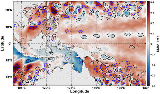 As shown in Figure 3, the independent detection results of eddies on September 18, 2023, are presented, with SLA values as the background field, overlaid with eddy boundaries: cyclonic eddies (black contours) and anticyclonic eddies (blue contours). MEs are mainly concentrated in the mid-latitude zones (10°N–25°N and 10°S–25°S), while eddy activity in the equatorial region is minimal.