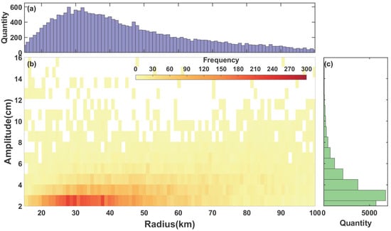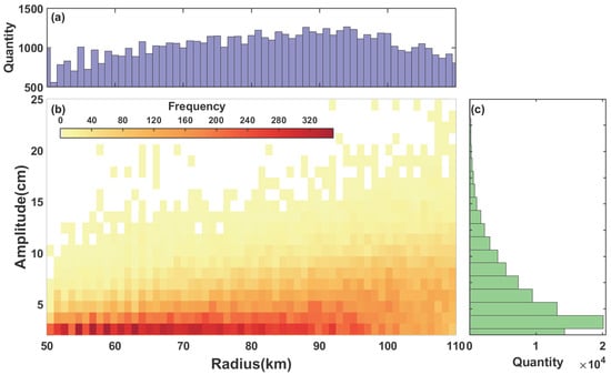Subsequent analysis employs frequency maps to investigate the characteristics of MEs and SMEs in the western tropical Pacific, focusing on their counts, radii, and amplitudes. As illustrated in Figure 5, eddy distributions reveal distinct trends. Radii of MEs exhibit relatively uniform spatial patterns, with a gradual increase in size across the region. However, the limitations of the DUACS dataset introduce uncertainties: eddies with radii below 50 km likely represent spurious detections lacking physical coherence, whereas those exceeding 50 km demonstrate stable counts (1000), which is only about forming the valid ME population.