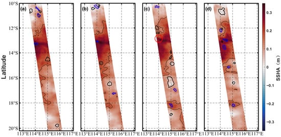The four orbital datasets presented in Figure 6 are derived from single-pass observations by the SWOT satellite during its Cal/Val phase, spanning 17–20 June 2023. During this period, the repeated orbital tracks consistently cover the same oceanic region with identical parameters, enabling clear tracking and observation of SME evolution over four consecutive days. Following data processing, eddies within the single orbital swath are identified: A persistent anomaly near 13°S is detected, corresponding to a SME anticyclonic eddy that exhibits an elongated morphology and slow eastward propagation over multiple days. However, this eddy is not identified in the third panel (June 19) due to its partial boundary extending beyond the orbital swath, which results in incomplete contour closure and thus precluded definitive detection. A cold-core eddy near 17.5°S displays rapid intensity fluctuations, weakening, intensifying, and then weakening again within the four-day window, underscoring the rapid variability characteristic of SME dynamics.