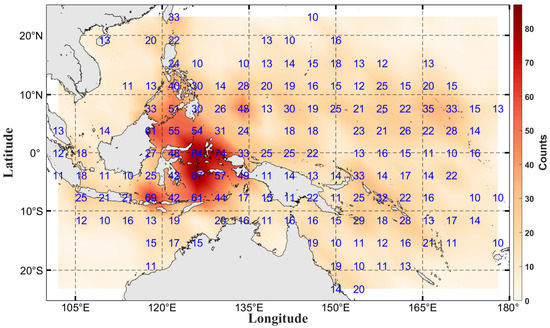 Eddy identification is re-conducted using science-phase SWOT orbital data, with 138 tracks traversing the study area. Each track is independently processed to detect SMEs. Aggregated results (Figure 9) display eddy core counts via numerical labels within rectangular subregions. The Indonesian Seas exhibit significantly higher eddy density due to anomalously intense internal tidal wave activity, which elevates submesoscale SLA variability [].