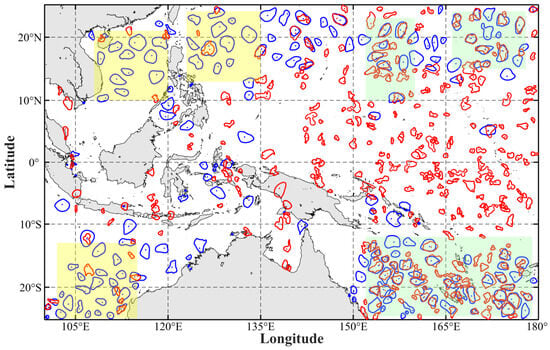 Although these methods were originally designed for ME detection, they remain applicable to SMEs due to structural similarities despite differences in spatiotemporal scales []. This study employs the closed contour method for SME detection in the western Pacific.