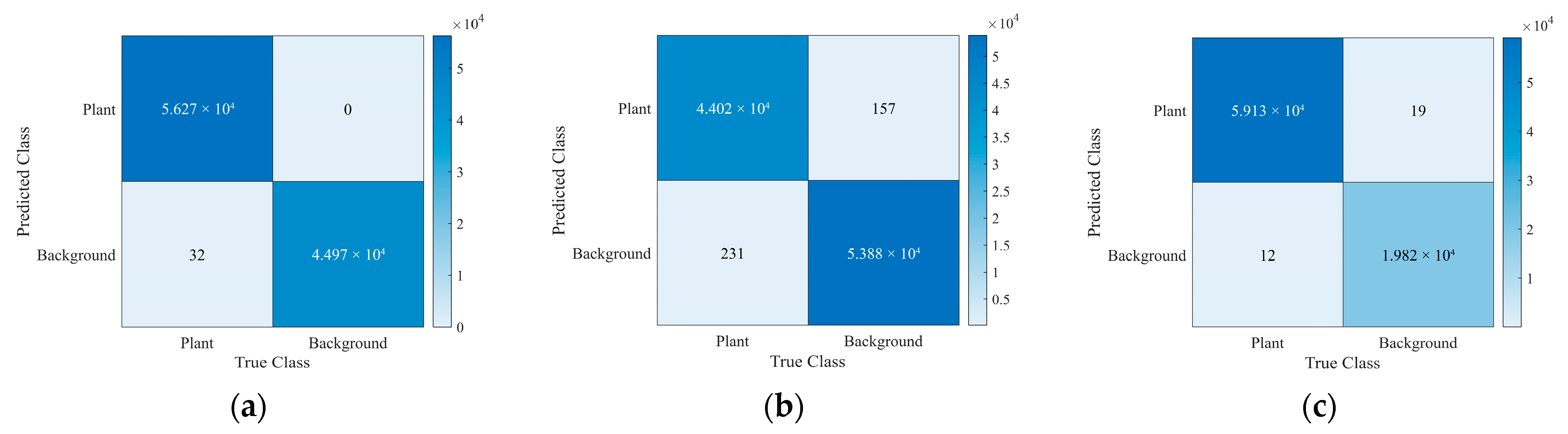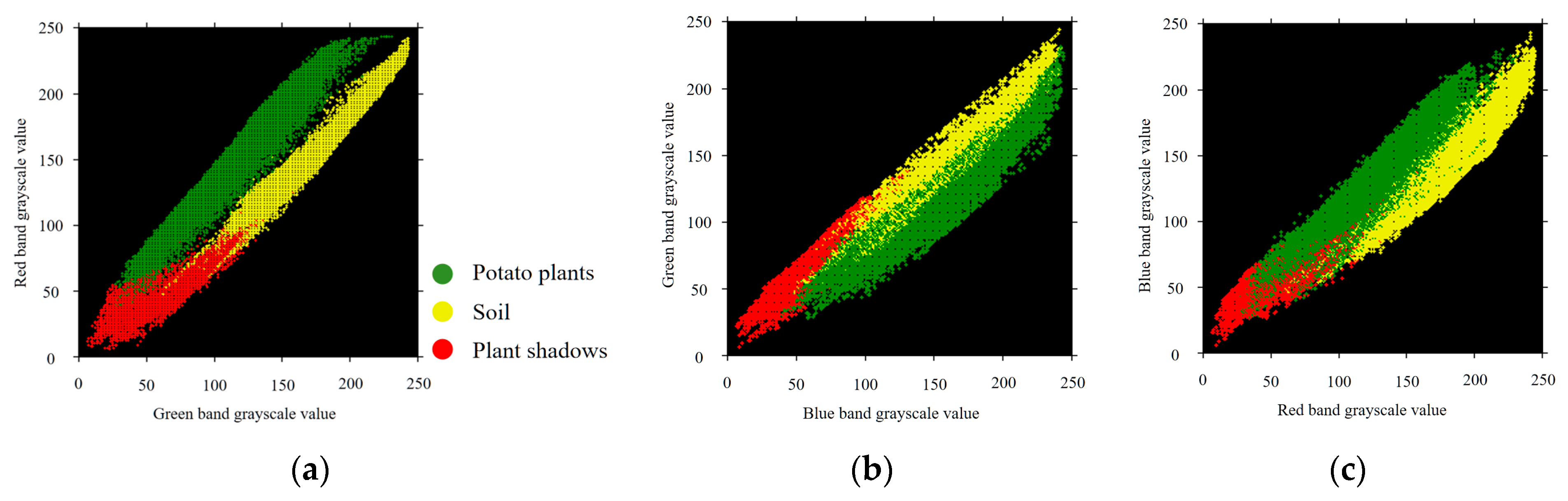 Table 7, the GRCVI proposed in this research exhibited robust discrimination capability for potato plants throughout all three growth phases. It delivered the highest overall accuracy and Kappa coefficient at both the tuber expansion and maturity stages. Specifically, the classification accuracy reached 99.78% (Kappa coefficient = 0.9957) during the tuber expansion stage and 99.56% (Kappa coefficient = 0.9884) during the maturity stage. Additionally, at the tuber formation stage, combining the GRCVI with the numerical intersection method produced the second-highest accuracy, achieving an overall classification accuracy of 98.99% and a Kappa coefficient of 0.9951.