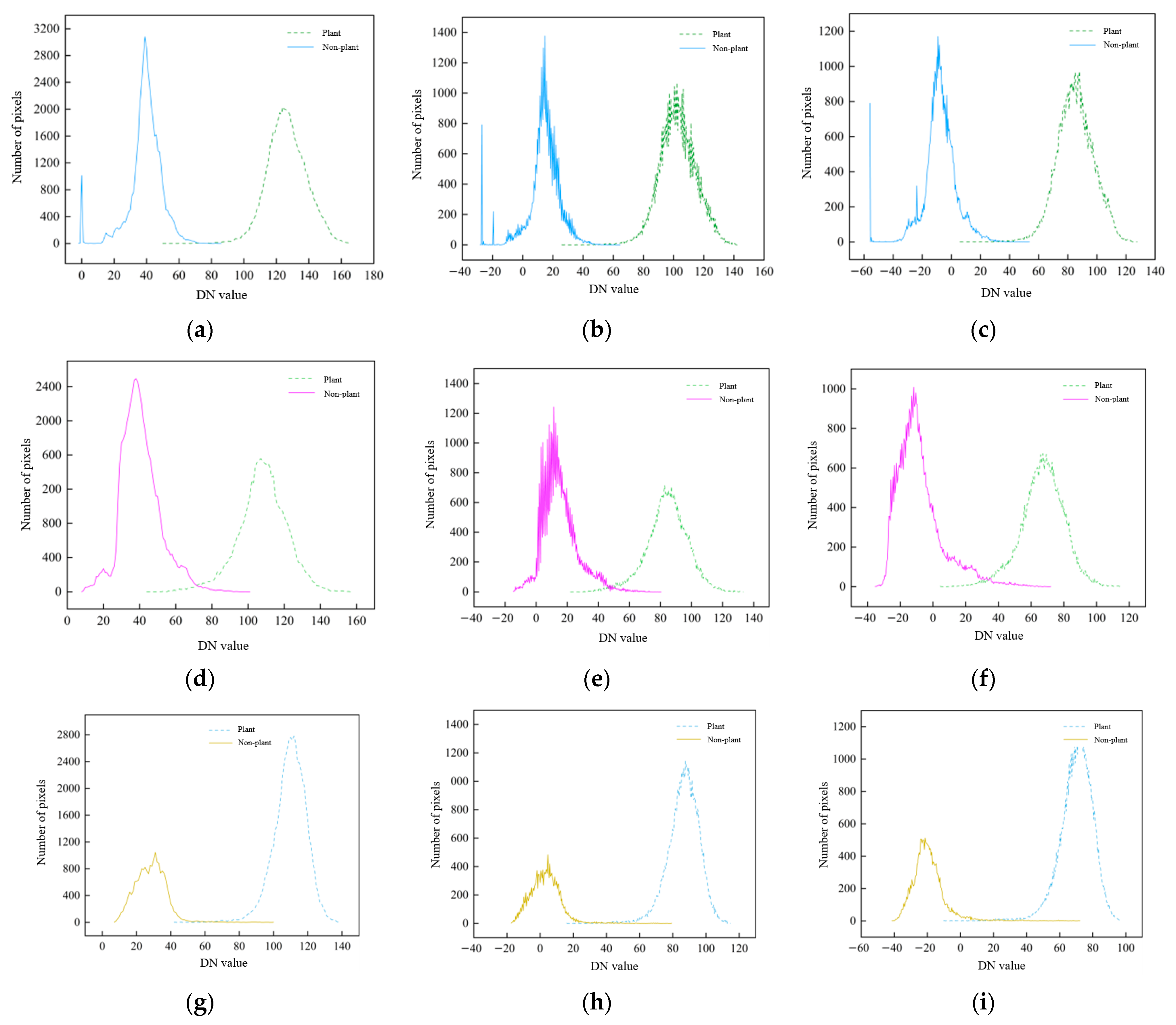 Table 3, the classification thresholds for all ten VIs across the three growth stages were determined using the numerical intersection method. Further analysis of the intersection curves revealed that the histogram distributions of plant and non-plant regions for five vegetation indices (GRVI, RGBVI, MGRVI, NGRVI, and NGBDI) exhibited considerable overlap. For clarity,