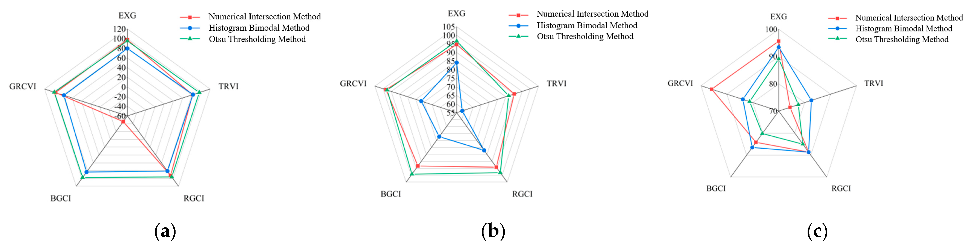 Table 5. To better illustrate the threshold extraction process using different VIs, this study presents the threshold results obtained by the numerical intersection method for three VIs: GRCVI, RGCI, and EXG across the three growth stages. The corresponding histogram curves for these stages were shown in