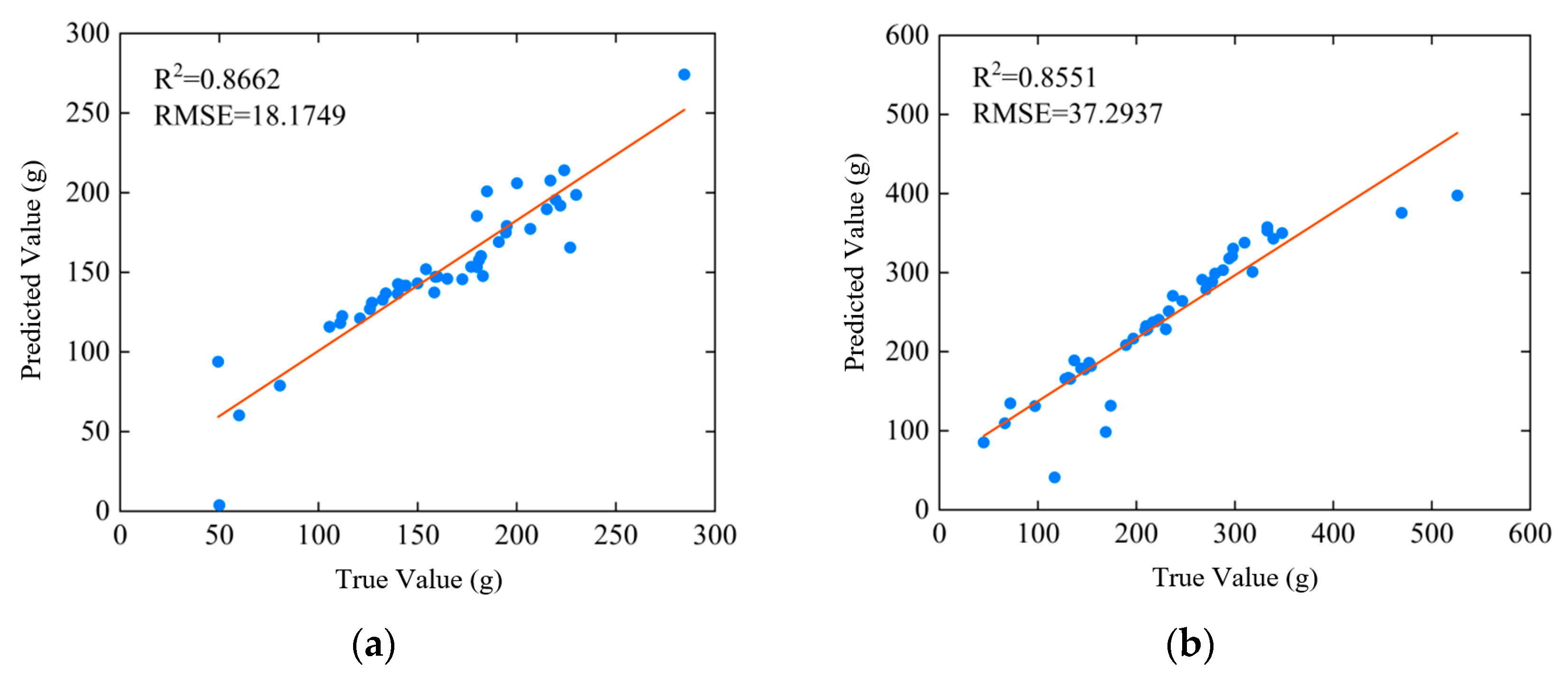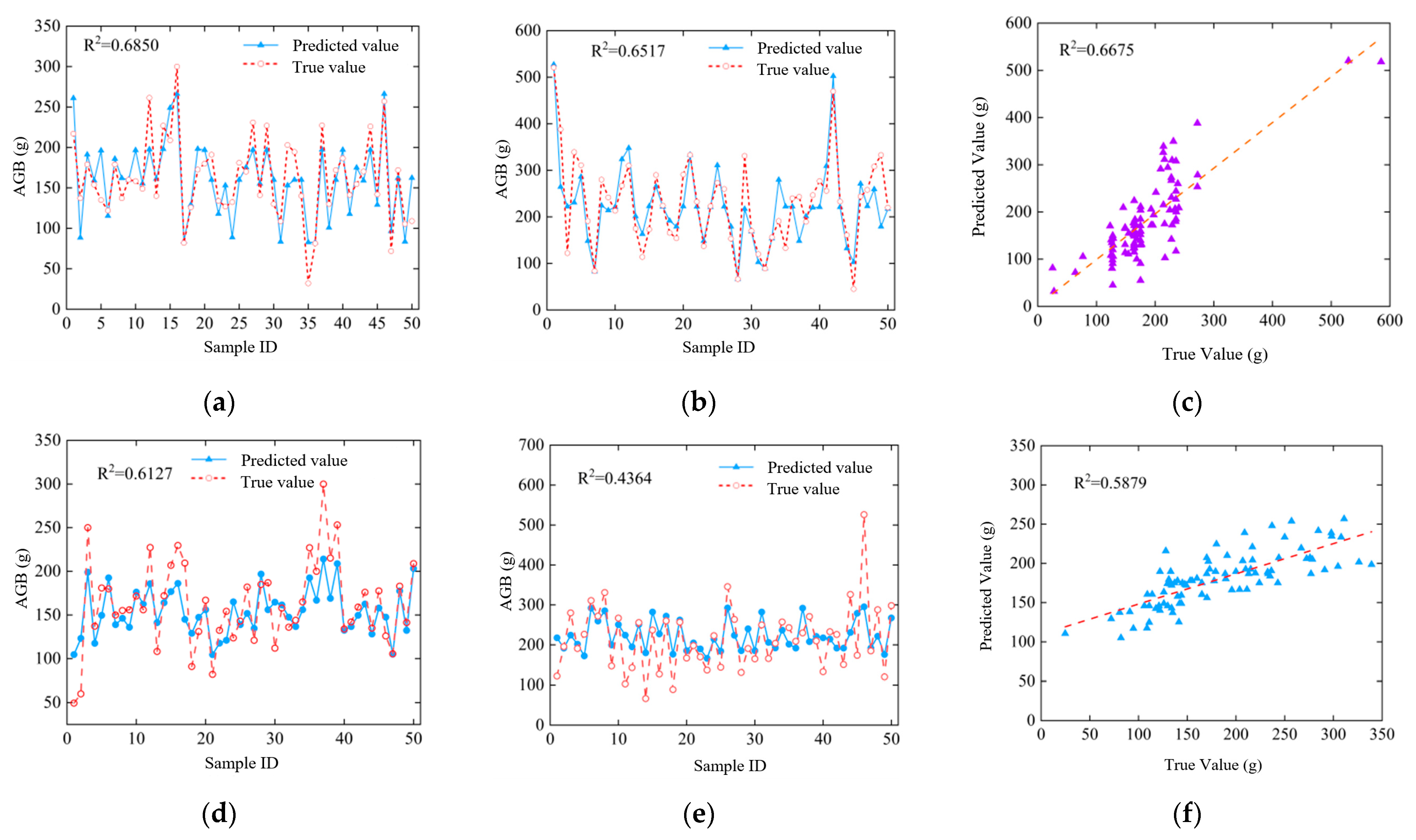 Figure 21b. However, the UAV-derived AGB model also provided reliable prediction performance, indicating that the proposed non-destructive UAV-based approach can achieve accurate yield estimation without the need for destructive ground sampling.