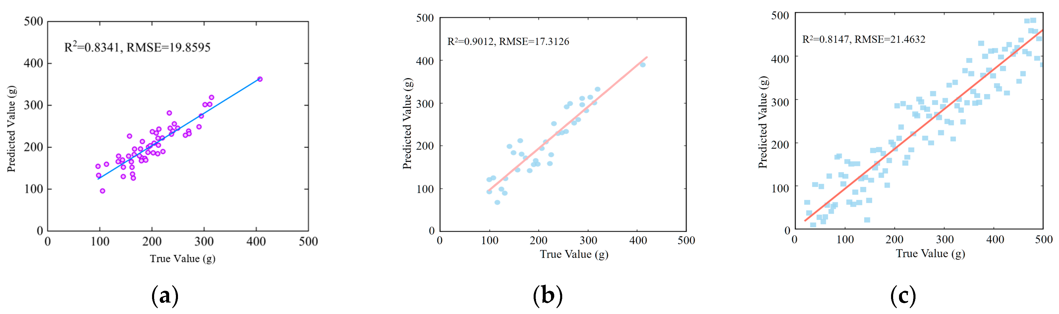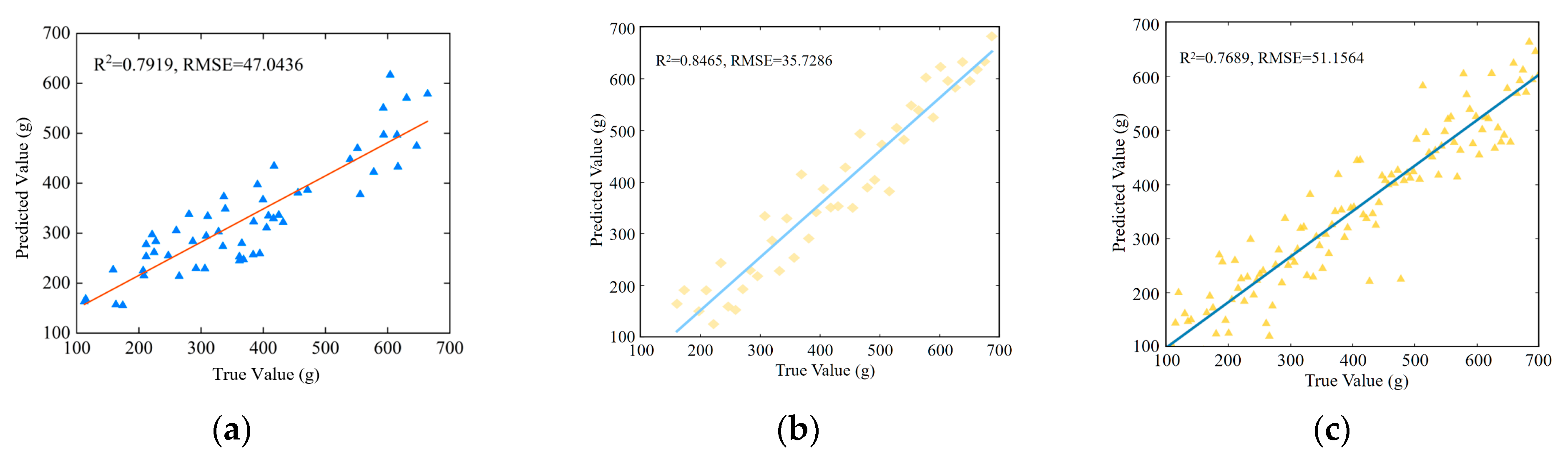 2 = 0.8147, RMSE = 21.4632 g), but the overall prediction accuracy remained stable, demonstrating that the model achieved reliable performance across different sampling subsets.