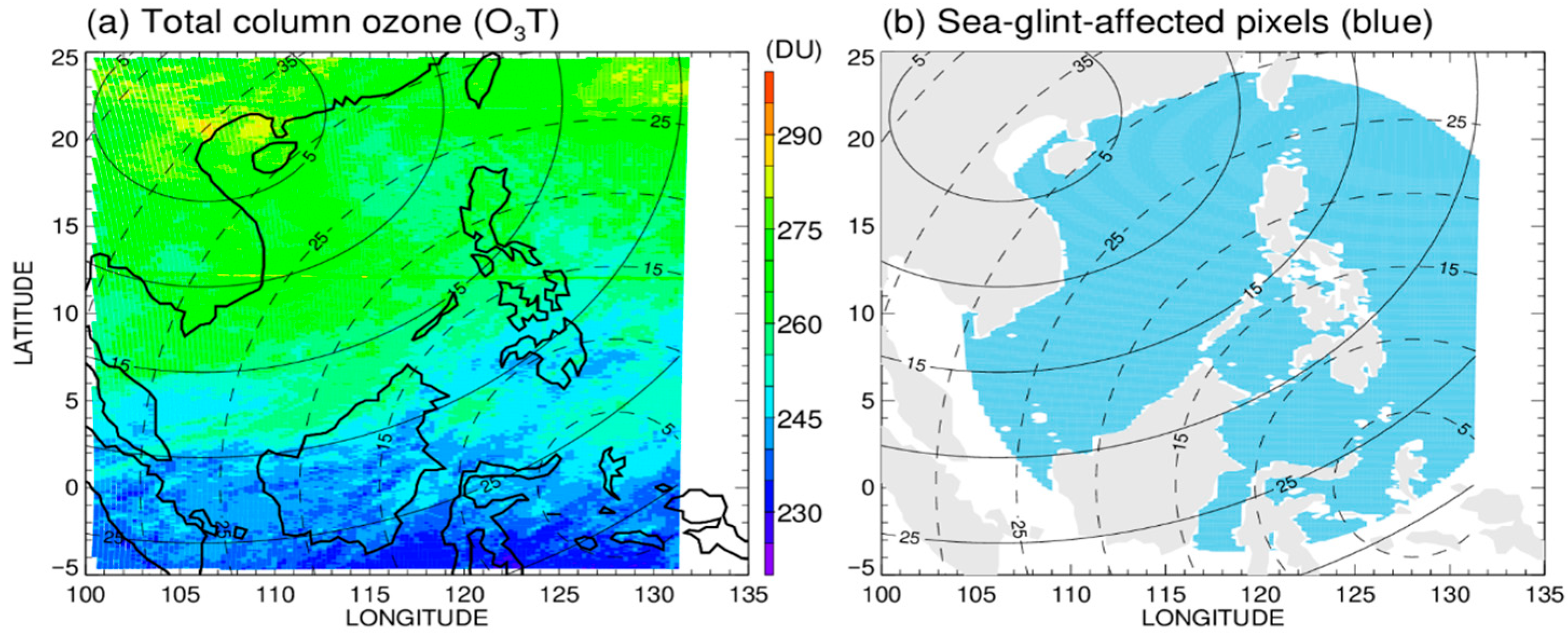 - Bhartia, P.K.; Wellemeyer, C. TOMS-V8 Total O3 Algorithm, in OMI Algorithm Theoretical Basis Document, vol. II, OMI Ozone Products, ATBD-OMI-02, Edited by P. K. Bhartia, pp. 15–31, NASA Goddard Space Flight Cent., Greenbelt, Md. 2002. Available online: https://eospso.nasa.gov/sites/default/files/atbd/ATBD-OMI-02.pdf (accessed on 18 September 2025).