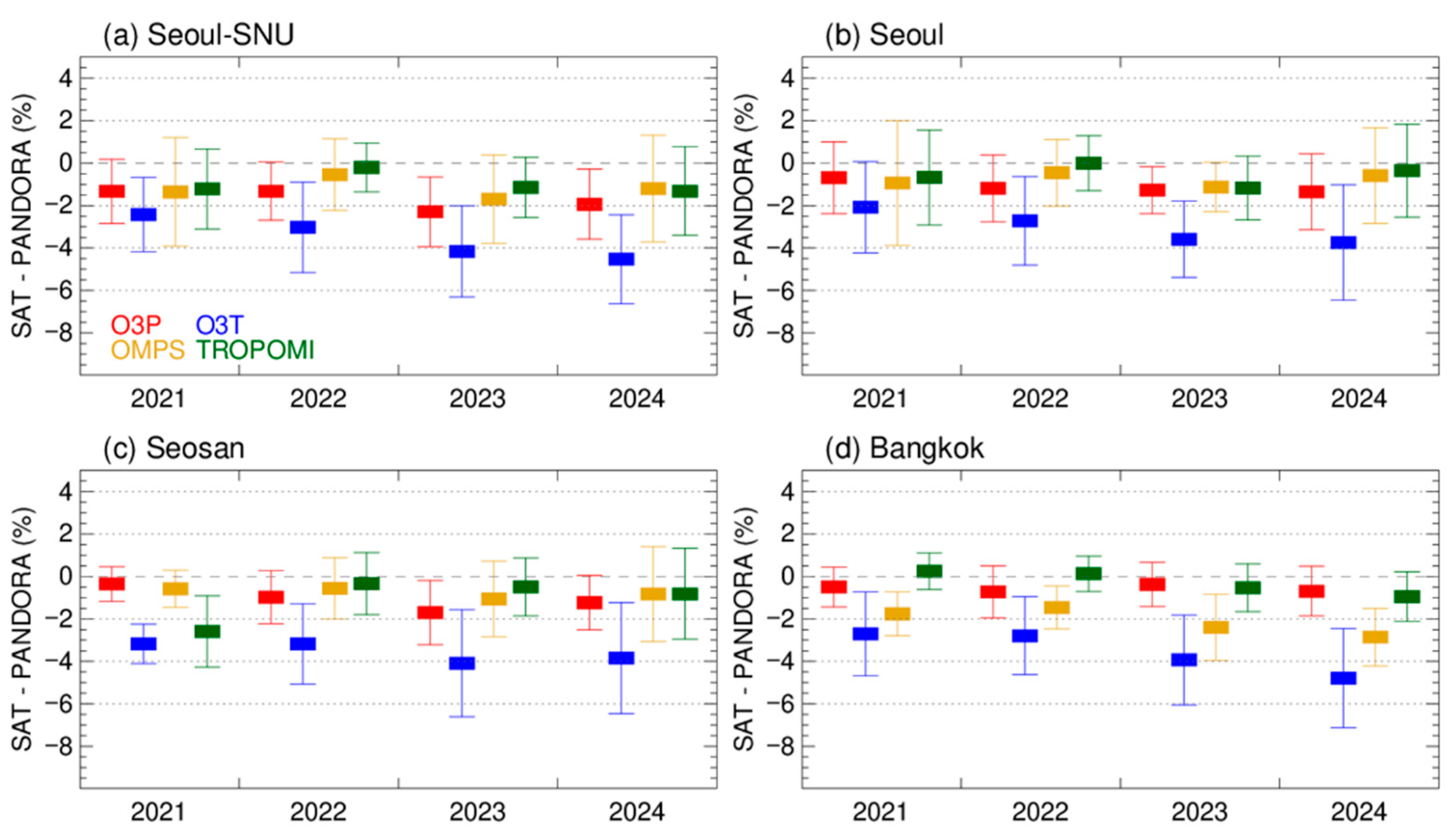 - Baek, K.; Bak, J.; Kim, J.H.; Park, S.S.; Haffner, D.P.; Lee, W. Validation of geostationary environment monitoring spectrometer (GEMS), TROPOspheric Monitoring Instrument (TROPOMI), and Ozone Mapping and Profiler Suite Nadir Mapper (OMPS) using pandora measurements during GEMS Map of Air Pollution (GMAP) field campaign. Atmos. Environ. 2024, 324, 120408. [Google Scholar] [CrossRef]