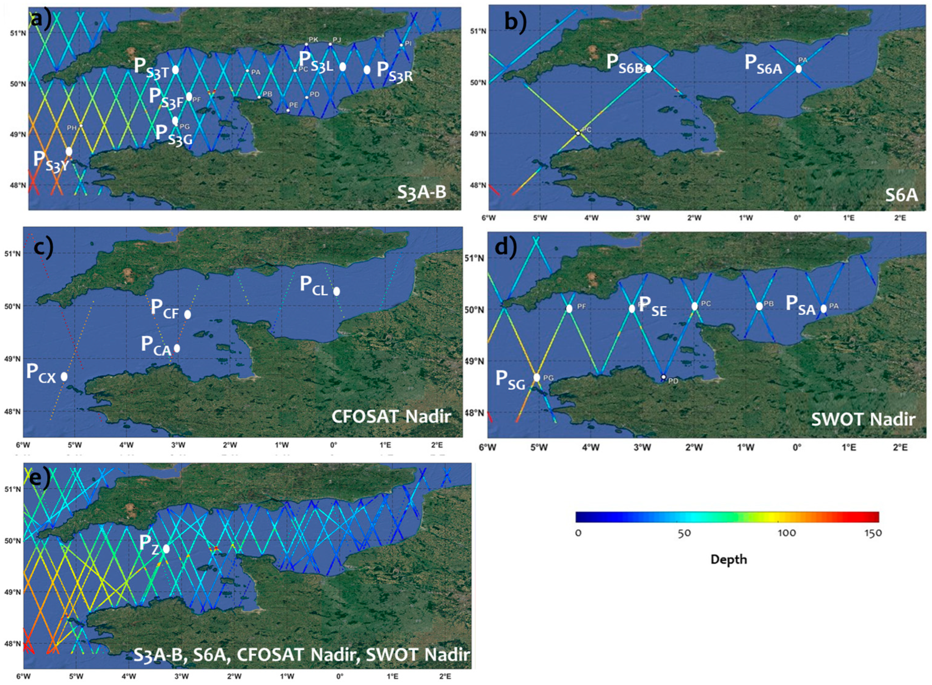 Altimeter SWH data from S3A-B (combined S3A and S3B missions), S6A, CFOSAT, and SWOT were used to examine temporal wave variability across the Channel at varying depths (locations defined in