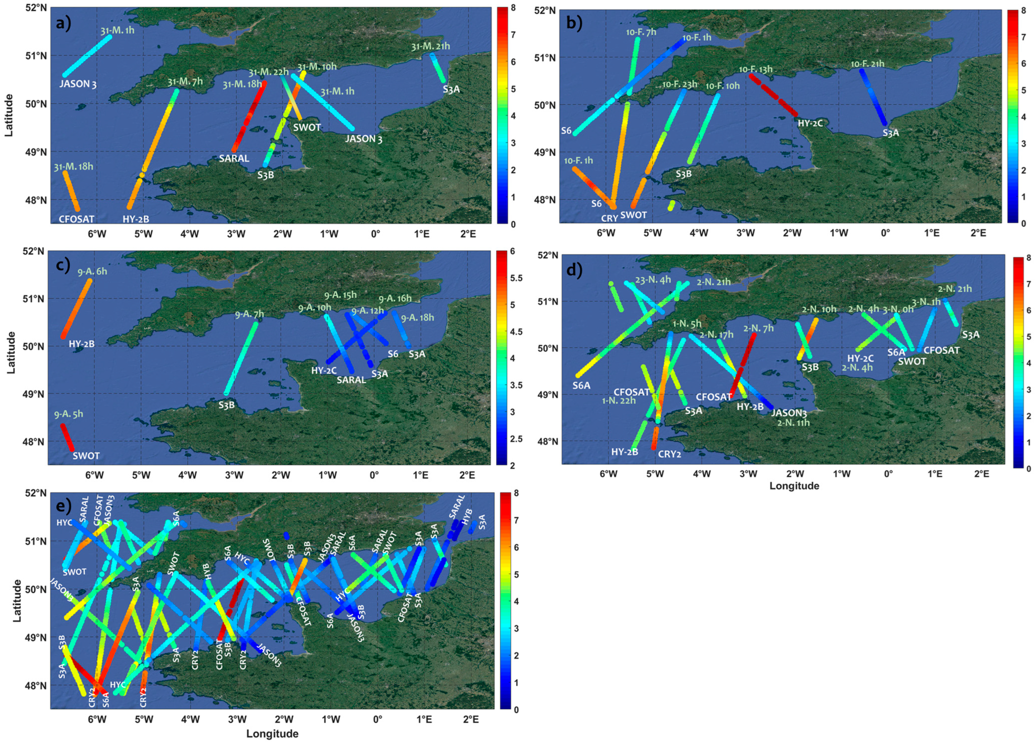 Figure 3e illustrates the evolution of SWH over a five-day period (30 October–4 November 2023), encompassing the storm event of Ciaran and two days before and after the event. An enhanced coverage of the Channel is observed by combining 45 satellite tracks: 7 from S3A, 5 each from S3B and S6A, and 4 each from Jason-3, Saral, CFOSAT, and SWOT.
