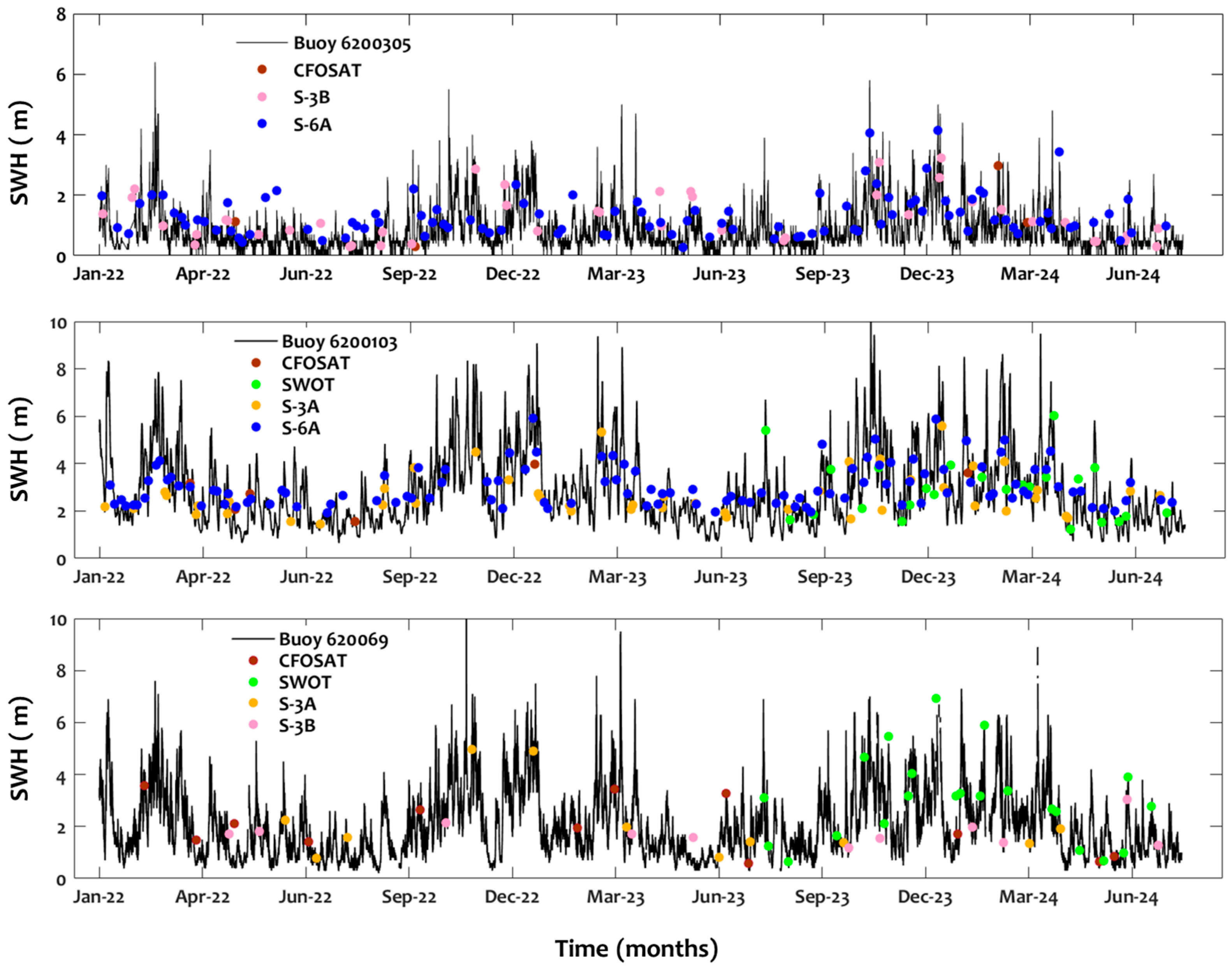 Overall, altimetry SWH observations reproduce significant wave heights accurately, including extreme waves (Hs > 3 m). Comparisons with S-3A and S-3B yield a mean RMSE (Root Mean Square Error) of 0.75 m and SD (Standard Deviation) of 0.62 m, with moderate waves (Hs < 2 m) overestimated by 15%. Strong agreement is also observed between in situ measurements and altimetry SWH from CFOSAT, SWOT, and S-6A, with RMSE and SD below 0.42 m.