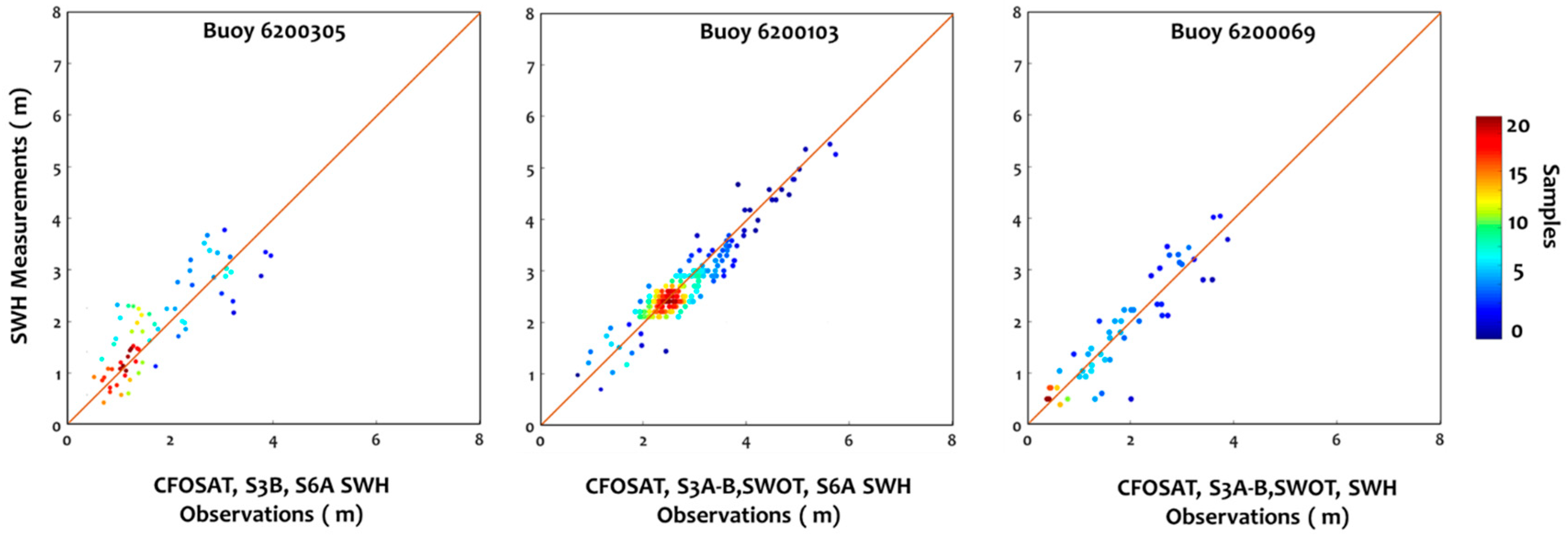 Figure 4): buoy 6200305 with CFOSAT, SWOT, S-3A, S-3B, and S-6A; buoy 6200103 with CFOSAT, SWOT, S-3A, and S-6A; and buoy 6200069 with CFOSAT, SWOT, S-3A, and S-3B.