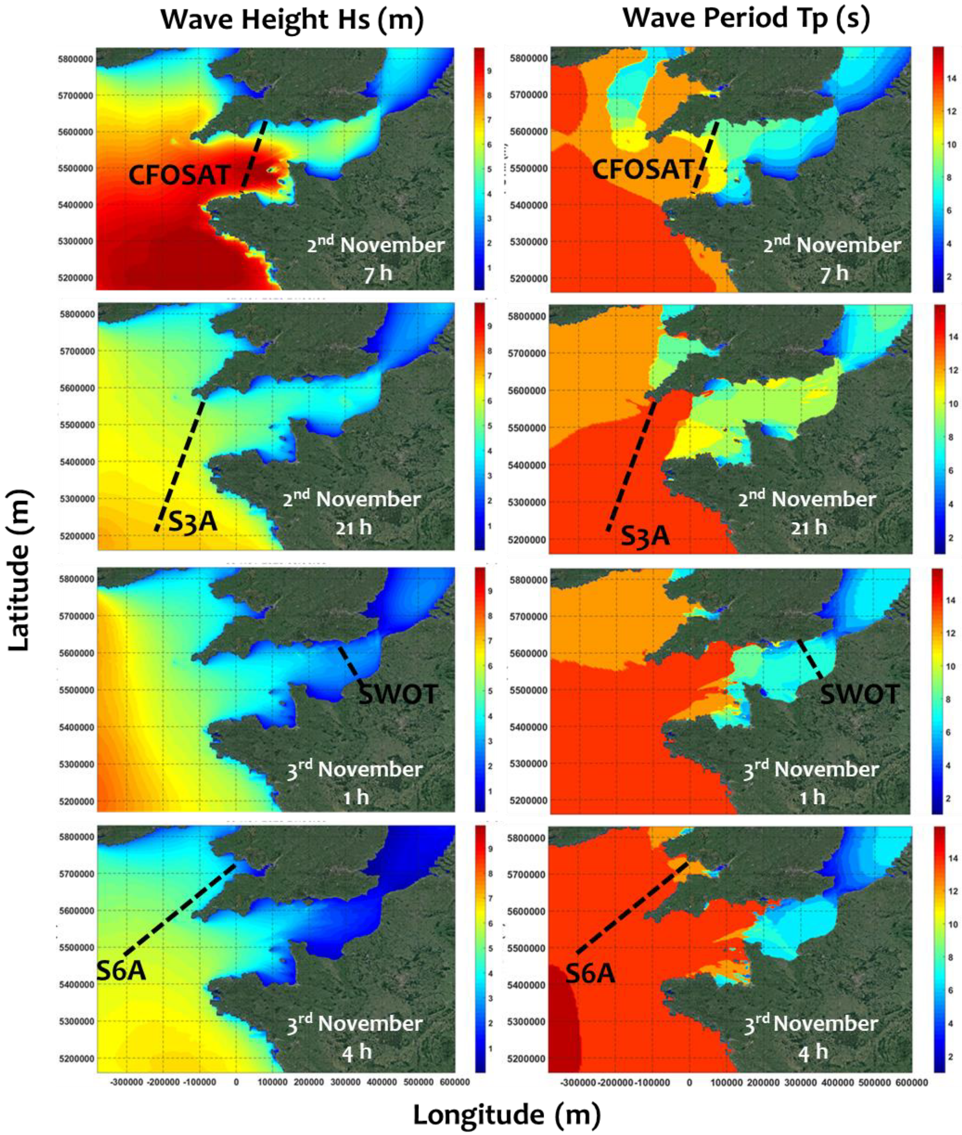 Wave modeling from the Atlantic to the English Channel and adjacent coasts was performed with DELFT3D during Storm Ciaran. Simulated Hs (significant wave height) and Tp (peak period) maps were extracted at the dates and times of the altimeter passes, with track positions shown in