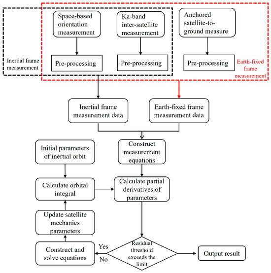 The integrated processing framework for BeiDou satellite orbit determination—combining satellite-to-ground, inter-satellite, and space-based orientation observations—proceeds as Figure 1. In the autonomous orbit determination mode, space-based orientation data and inter-satellite navigation measurements are first subjected to preprocessing. Subsequently, measurement models are formulated, partial derivatives of the relevant parameters are computed, and orbit integration is conducted. The satellite’s dynamical parameters are iteratively updated, and a residual threshold criterion is applied to determine the convergence of the solution, at which point the satellite orbit is resolved in the inertial reference frame. In the semi-autonomous orbit determination mode, the incorporation of satellite-to-ground measurement data from ground anchor stations enables the establishment of geometric links between satellite-to-ground and inter-satellite observations. This integrated dataset facilitates the estimation of satellite orbit parameters within the Earth-fixed reference frame.