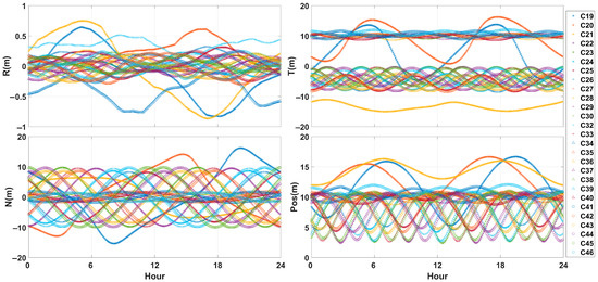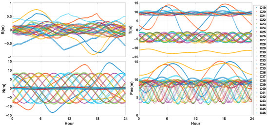 Two experiments are designed, which are, respectively, 90 days of autonomous operation for BeiDou satellites supported only by inter-satellite link data (ISL), 90 days of autonomous operation for BeiDou satellites supported by the inter-satellite link data and space-based orientation data (ISL + SO). After 90 days of autonomous operation for BeiDou satellites supported only by inter-satellite link data, the time series of the radial (R), tangential (T), and normal (N) determination errors and the 3D positions under the Earth-fixed reference system are illustrated in Figure 2. C19, C20,…, C46 are the PRN of the Beidou satellite.