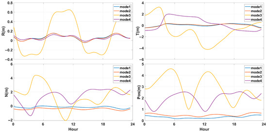 Experimental analysis is also conducted under the four semi-autonomous operation modes designed in Section 4.2.2. The random noise and constant systematic error of space-based orientation data are consistent with the settings in Section 5.1. Using the BeiDou precision orbit released by the Multi-GNSS Experiment (MGEX) analysis center as the reference, the orbit determination accuracy of the BeiDou satellites after 90 days of semi-autonomous operation is evaluated, which represents the absolute processing accuracy of the spatial reference of the BeiDou satellite in the Earth-fixed reference system. The orbit accuracy details of BeiDou satellite C27 after 90 days of semi-autonomous operation in the four modes are compared in Figure 6.