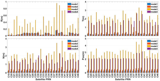 The orbit accuracies of the BeiDou satellites in the four semi-autonomous operation modes are shown in Figure 7.