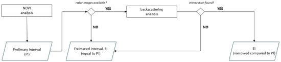 Flow chart of the methodological framework developed to estimate the occurrence intervals of landslides. The process follows a sequential and conditional structure, starting with the identification of the Preliminary Interval (PI) through a multi-temporal analysis of the NDVI index derived from Sentinel-2 imagery. The subsequent step depends on the availability of Sentinel-1 radar acquisitions within the PI: if at least one radar image is available, a backscatter analysis is performed on all combinations of polarization (VV and VH) and orbital geometry (ascending and descending); if no consistent signal variations are detected, the PI is assumed as the Estimated Interval (EI) (estimated activation window). Conversely, the detection of radar anomalies allows for the definition of a new, narrower predicted interval.