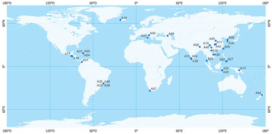 Spatial distribution of the 46 landslides examined, represented by blue circles labeled with their IDs. (Global System WGS 84, EPSG:4326).