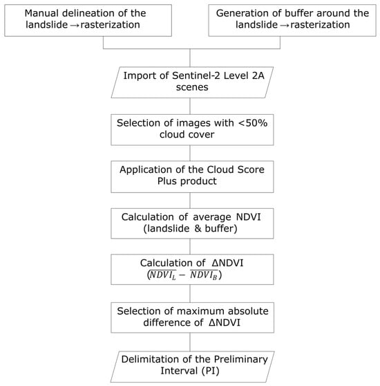 The process begins with the analysis of optical images using the NDVI to identify the PI. This temporal interval is defined by the two temporal extremes at which a change in vegetation cover is observed within the landslide area: the first extreme corresponds to the last date when vegetation cover was present, while the second marks the first date when vegetation was reduced or is absent.
