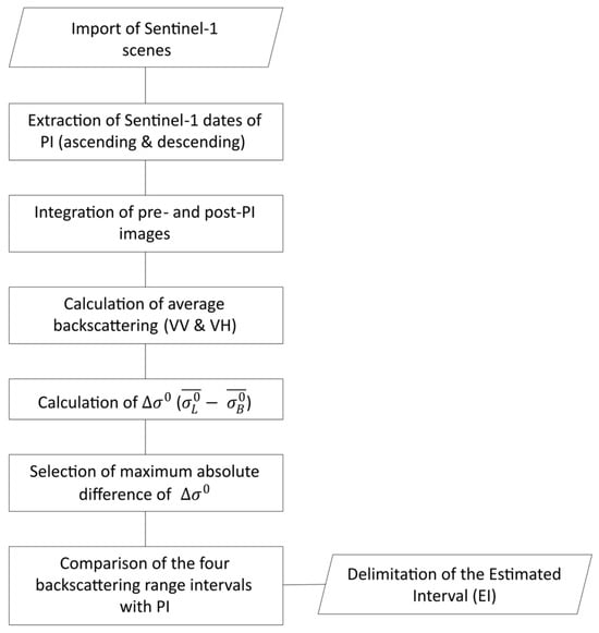 Similarly to what is done for the NDVI, the script iterates over the time series of backscatter differences (∆σ0), calculating for each pair of consecutive dates the absolute variation of the mean values in dB. Among all the variations obtained, the one with the greatest amplitude is identified (one for each of the two or four datasets). The interval corresponding to the most pronounced change in the radar signal for each dataset of images (Temporal Interval VH polarization Ascending orbit, VH-A; Temporal Interval VV polarization Ascending orbit, VV-A; Temporal Interval VH polarization Descending orbit, VH-D; Temporal Interval VV polarization Descending orbit, VV-D) is then assumed as the interval of landslide collapse initiation, the Estimated Interval (EI) (Figure 4).