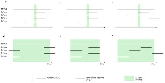 Scenarios of the intersection between backscattering-based time intervals and the PI derived from NDVI. Black horizontal lines represent the time intervals identified through radar backscattering, while the gray line indicates the PI derived from ∆NDVI. The figure displays six possible configurations, ordered according to the number of overlapping radar intervals. Panel (a) shows a complete intersection of all four radar intervals with the PI, panel (b) presents a intersection of three out of four radar intervals, while in panel (c), only two intervals overlap. Panel (d) illustrates a situation where two distinct pairs of radar intervals overlap separately, but the resulting overlaps fall outside the PI. Panel (e) shows a similar case with two distinct pairs of overlapping radar intervals whose combined effect reduces the PI. Panel (f) represents the case in which no intersection occurs between the radar intervals, and the entire PI is adopted as the estimated triggering interval.