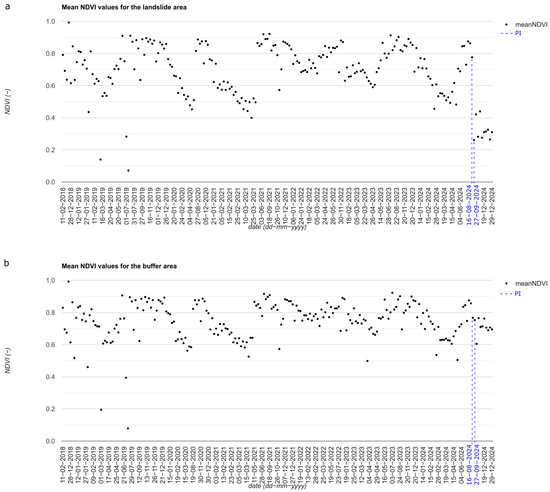 Trend of mean NDVI values automatically calculated by the script for landslide A28. (a) landslide area, (b) undisturbed buffer area. The blue lines and dates indicate the PI.