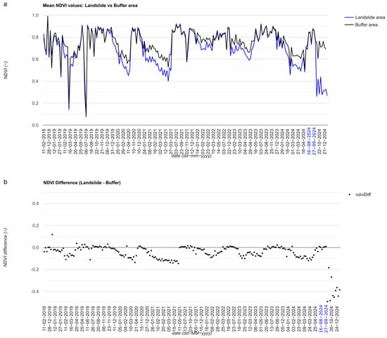 Comparison between mean NDVI values in the landslide area and the buffer area for landslide A28. (a) overlay of mean NDVI values for both areas; (b) ∆NDVI trend, calculated as the difference between landslide mean NDVI and buffer mean NDVI. The blue dates indicate the PI.