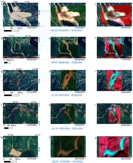 Knowing the initiation time represents a fundamental factor in defining critical thresholds [26]: for example, knowing exactly when the event occurred makes it possible to more accurately determine the intensity and duration of the precipitation that led to the slope failure. In the literature, the comparison of pre- and post-event satellite images [27] has proven extremely useful for identifying the exact chronology of events and for performing an in-depth analysis of soil changes [28]. Traditionally, these comparisons often rely on semi-automated technologies, with QGIS, Python, or R, which require manual intervention for data interpretation. Such a comparison makes it possible to identify changes in soil structure and vegetation cover [29], highlighting areas that have undergone significant alterations because of the landslide displacement [30].