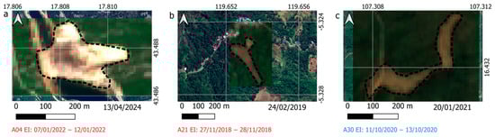 Conversely, if the backscatter analysis shows an intersection between at least two time intervals, meaning two dates that delimit an interval of signal variation consistent with a potential landslide event, a new EI is defined based on the radar data.