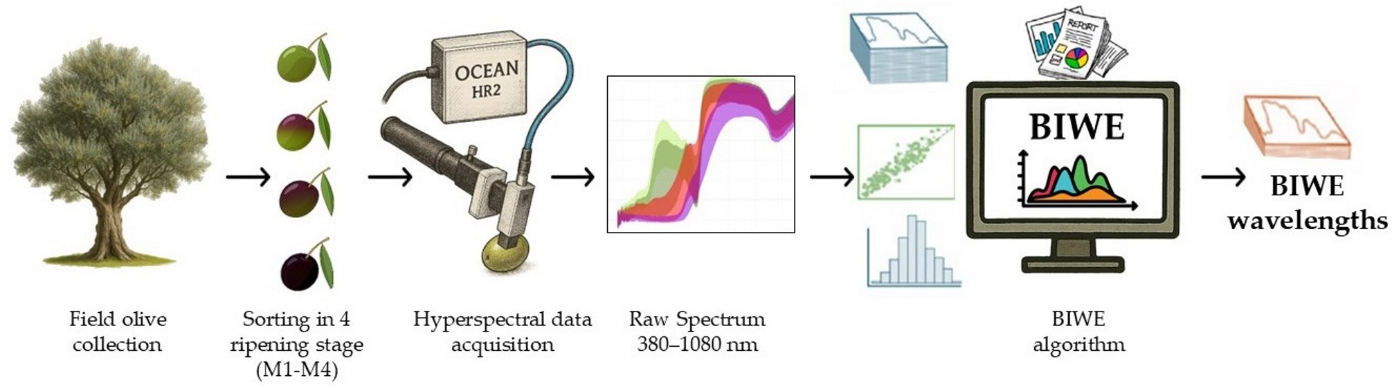 Distefano, M.; Avola, G.; Cantini, C.; Gioli, B.; Cavaliere, A.; Riggi, E. A Biologically Informed Wavelength Extraction (BIWE) Method for Hyperspectral Classification of Olive Cultivars and Ripening Stages. Remote Sens. 2025, 17, 3277. https://doi.org/10.3390/rs17193277