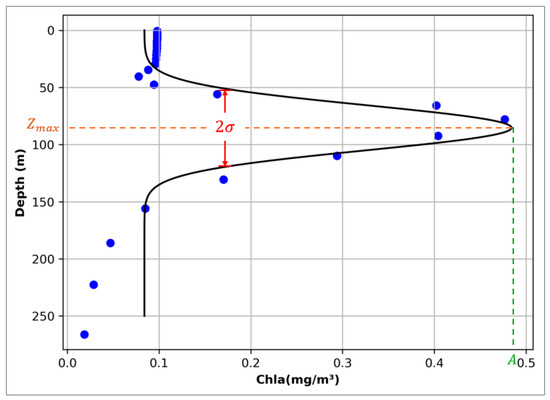 In the Gaussian fitting function, represents the baseline parameter, represents the peak or amplitude of the Gaussian curve, indicates the position of the amplitude, represents the standard deviation of the Gaussian curve. If the parameters of the Gaussian fitting function are converted into SCM characteristics, represents the chlorophyll level of the subsurface background constant, represents the peak of chlorophyll concentration, represents the maximum depth of chlorophyll concentration, and 2 represents the thickness of SCM [22]. In the previous process of identifying SCM profiles by BGC-Argo, complex profile processing and error correction processes would be experienced [23,24,25]. By using Gaussian curve fitting, SCM can be judged and extracted directly through the changes in mathematical parameters, and the process is more concise and effective.