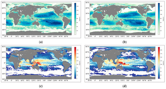 Globally, the depth of the SCM in nearshore waters is generally around 60 m. With increasing convergence with land, the depth of SCM in oceanic waters can reach 140 m. In terms of distribution structure, the depth distribution of SCM in the North and South Pacific is separated by the equator, forming two independent bowl-shaped structures. In terms of seasonal variations, SCM is not obvious in changes between winter and summer in either hemisphere (Figure 2a,b). The results of these data and structures are also in line with the current observational results and numerical simulations for global sea regions [4,32].