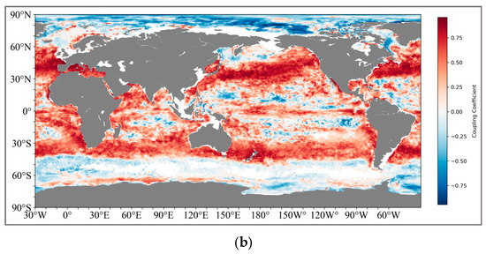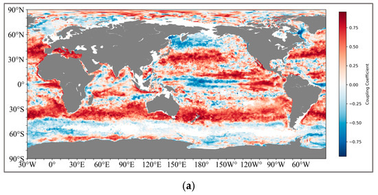 For the coupling results of the pycnocline with the maximum change rate and SCM, the coupling relationship between the two is obviously not as tight as that of the thickness. Although there is still a positive coupling correlation in the South Pacific and the South Atlantic (25°S–40°S), the coupling coefficients generally fluctuate around 0.5. However, in the middle and high latitudes of the North Pacific (45°N–65°N), a negative correlation is shown.