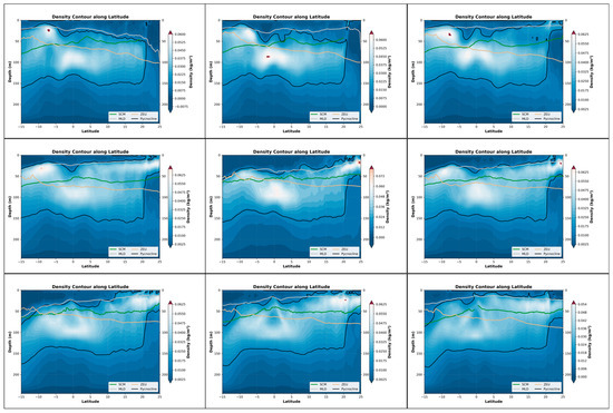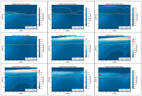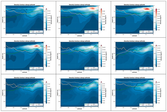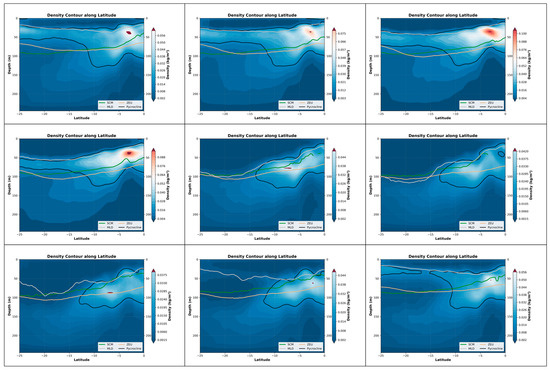 Nine-month variations in the pycnocline, SCM, MLD, and ZEU along latitude in the Indian Ocean (25°N–15°S, 45°E–110°E). The three panels in each row represent the three months with the most significant changes within a four-month period. Specifically, the top row corresponds to January–April, the middle row to May–August, and the bottom row to September–December. These nine months are arranged in left-to-right and top-to-bottom order, with the earliest month positioned at the top-left corner and the latest month at the bottom-right corner. The background color represents the rate at which the density changes in depth.