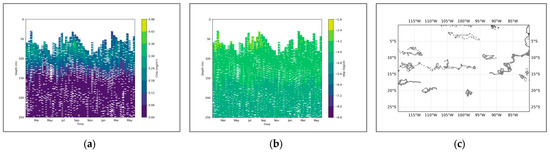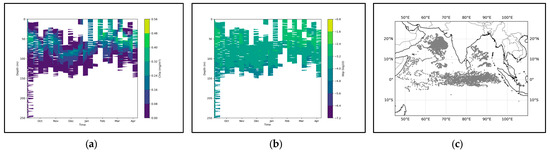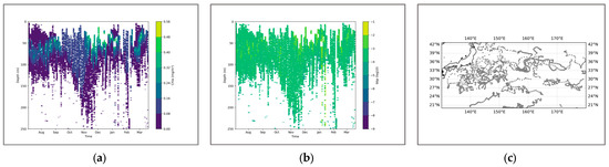 Among them, represents the depth corresponding to the maximum chlorophyll content in each 1° × 1° grid section. Thickness represents the thickness of the pycnocline, measured in meters, and the value selected is the difference between the upper and lower boundaries of the pycnocline. Intensity refers to the peak value of the intensity in the pycnocline profile, measured in milligrams per cubic meter. Depth represents the depth at which the density change rate is the greatest, also measured in meters, and it is used to correspond with the position of the maximum value of chlorophyll. represents the weight coefficient. In the selected region, we use the above equation as the way to describe the parameters of SCM. To verify the accuracy of the results, we matched similar BGC-Argo data on a temporal and spatial scale, which serves as an important reference for a more detailed description of the seasonal variation process.