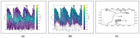 (a) shows the chlorophyll profile. (b) shows the BBP profile. (c) illustrates the distribution of BGC-Argo floats in the South Atlantic region.