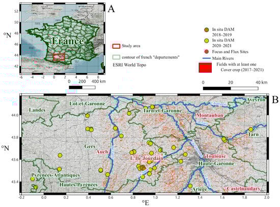 Location of the study site in southwestern France (area marked with a red rectangle (A)), as well as the network of fields studied (B). The two agricultural fields where the eddy covariance flux towers were installed are highlighted in red (AUR for Auradé, PIB for Pibrac), while the 49 fields where 185 cover crop biomass samples were collected are shown in orange and yellow, the difference depending on the measurement campaign considered (2018–2019 in orange, 2020–2021 in yellow).
