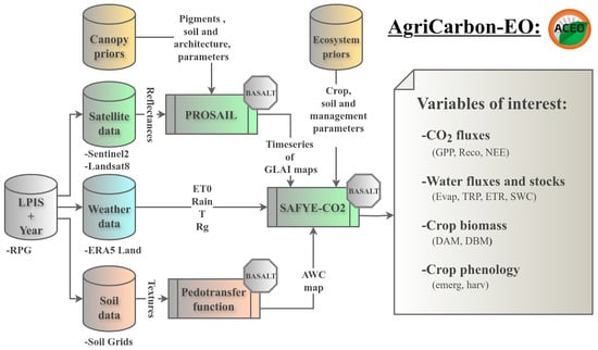 - Wijmer, T.; Al Bitar, A.; Arnaud, L.; Fieuzal, R.; Ceschia, E. AgriCarbon-EO v1.0.1: Large-Scale and High-Resolution Simulation of Carbon Fluxes by Assimilation of Sentinel-2 and Landsat-8 Reflectances Using a Bayesian Approach. Geosci. Model Dev. 2024, 17, 997–1021. [Google Scholar] [CrossRef]