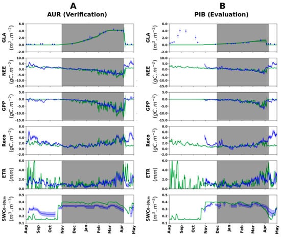 Temporal evolutions of the in situ or satellite-derived measurements (in blue) and modeled (in green) GLAI, NEE, GPP, RECO, ETR, and SWC0–30 cm for the two flux tower sites of Auradé (A) and Pibrac (B) (AUR and PIB, respectively). The graphs focus on the fallow period, with gray areas indicating the presence of a cover crop. The results from the AUR site correspond to a verification of the parameterization, and those from the PIB site to an independent evaluation of the proposed approach.