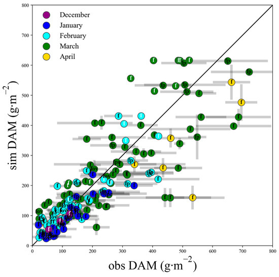 Comparison between the measured and the simulated cover crop biomass. Measurement months are differentiated by the color of the points. Points with f concern faba beans biomass measurements; p, phacelia; and fp a mix of both. Points with white text were measured during the 2018–2019 fallow and with black text during the 2020–2021 fallow period. The gray bars correspond to an error of 1 sigma for each point.