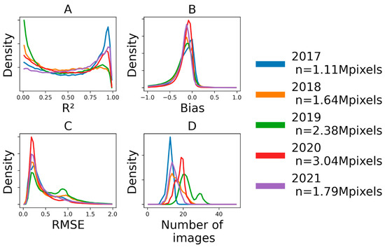 Distribution of the statistics between simulated GLAI values and those derived from optical satellite images at pixel scale (i.e., coefficient of determination (A), R2, bias (B), and root mean square error (C), RMSE), with the number of images (D) for the 2017–2021 period.