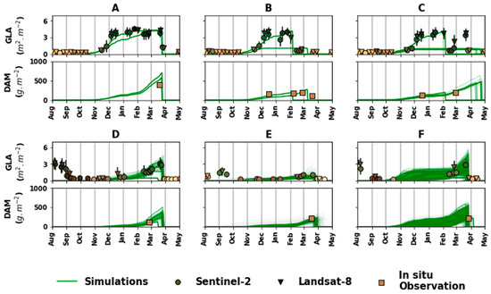 Examples of temporal evolutions of the satellite-derived (circles for Sentinel-2 observations and triangles for Landsat-8, the colors correspond to a RGB color composite from the RGB reflectance observed by satellite) and estimated (green lines) GLAI and DAM during the fallow period. In situ DAM measurements are represented by brown squares. The examples illustrate: (A) a long, well-developed CC, (B) early CC death, (C) severe damage followed by CC recovery and growth, (D,E) low CC development, and (F) a small number of satellite images during the CC growth period.