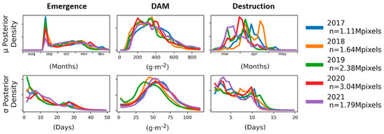 In these examples, image acquisitions are numerous and regular. The model reproduces the different vegetation states observed by the optical satellites, with a greater dispersion of solutions when canopy development levels are low (cases D and E). The events observed in case C (i.e., canopy mortality followed by renewed growth) lead to solutions that are split between a short cycle with high leaf area index values, and a long cycle associated with a low level of vegetation development. Finally, in Figure 6F, only a small number of satellite images were available. The dispersion between solutions is therefore significant, with the inversion approach not being able to differentiate different growth dynamics given the lack of relevant information.