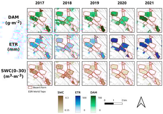 After characterizing the model’s performance based on various observations relating to biomass, carbon, and water budgets, simulations were carried out on the Sentinel-2 tile of interest during five consecutive fallow periods (between 2017 and 2021). First results present the model’s ability to reproduce the spatio-temporal development of cover crops. Then, the results of biomass estimates, dSOC, ETR, and soil water content are presented and analyzed.
